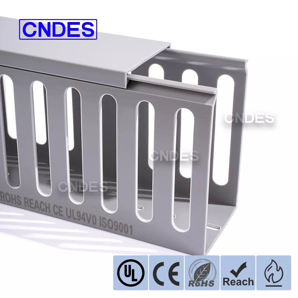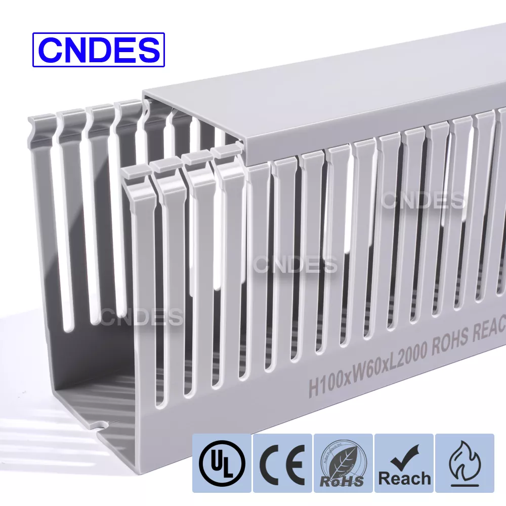 Slot Ketepatan- Alur Ketepatan – Saluran PVC Berkualiti 100×60 Untuk Panel Elektrik menampilkan reka bentuk alur yang seragam, membolehkan kabel keluar dengan bersih dari sebarang kedudukan; corak lubang tersuai tersedia sebagai pilihan..