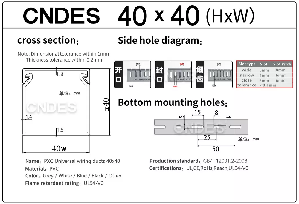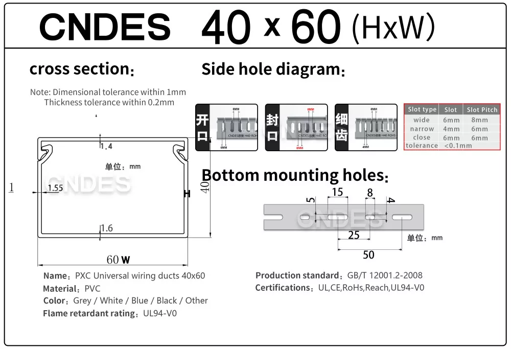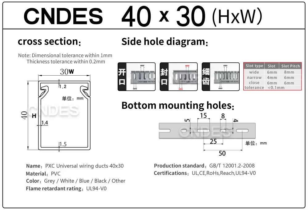 CNDES ialah pengeluar & pembekal Salur Lumba Pendawaian PVC Berslot Utama. Di sini kami akan memperkenalkan dulang kabel berketinggian 40mm kami, termasuk 40*25, 40*30, 40*35, 40*40 dan 40*60.