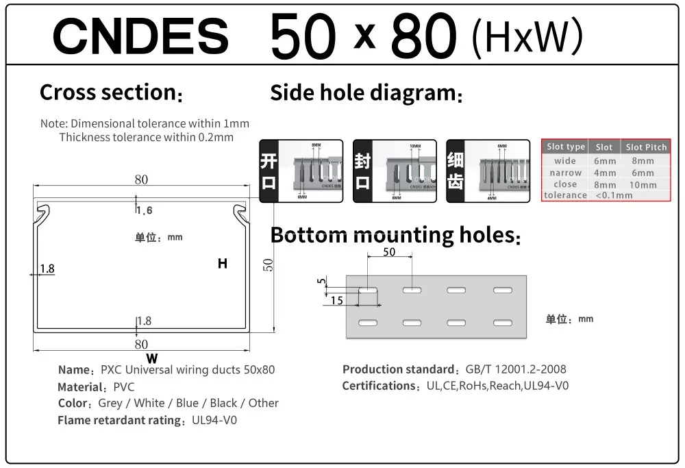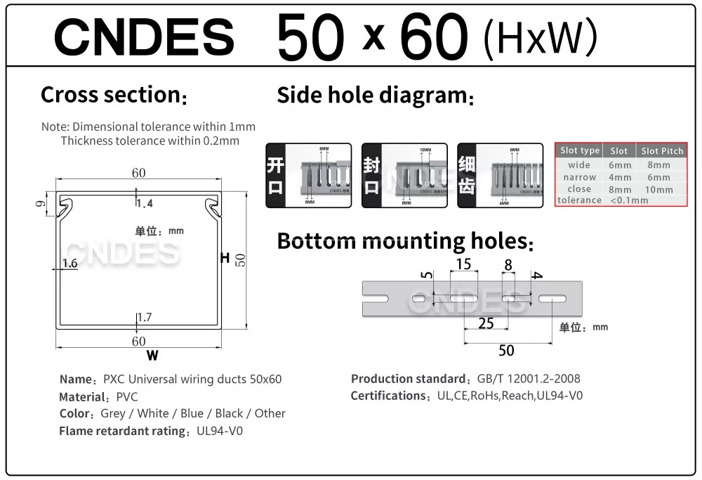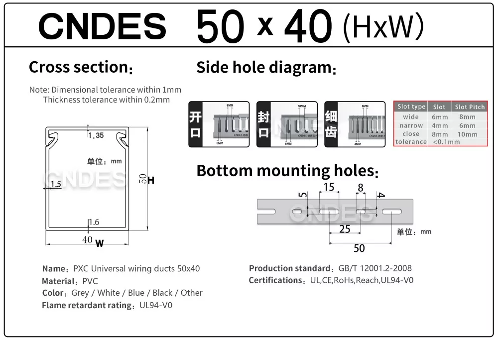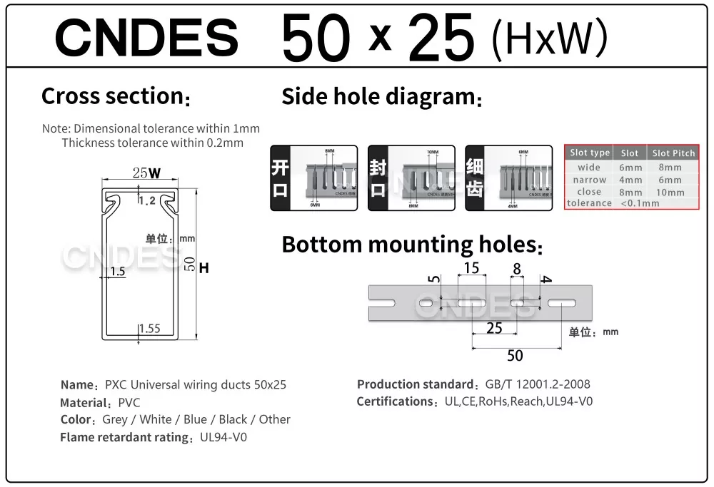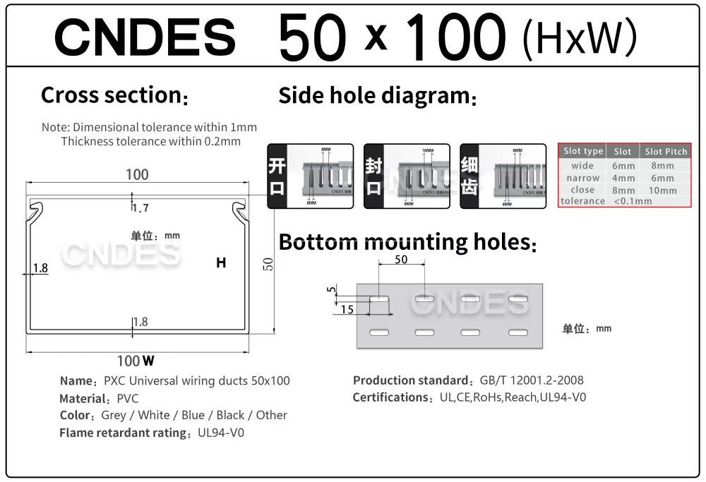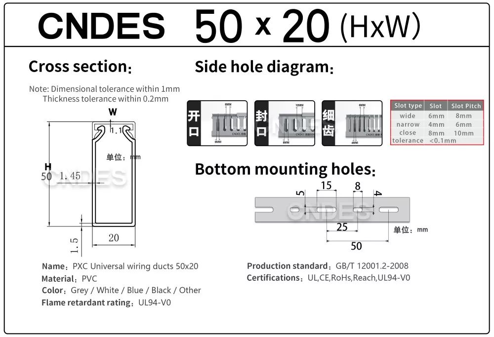 CNDES ialah pengilang dan pembekal yang mengkhusus dalam membekalkan Saluran Pendawaian Panel PVC Berslot. Di sini kami akan memperkenalkan trunking pendawaian tinggi 50mm kami, termasuk spesifikasi berikut:50*20,50*25,50*30,50*35,50*40,50*45,50*50,50*55,50*60,50*80,50*100.