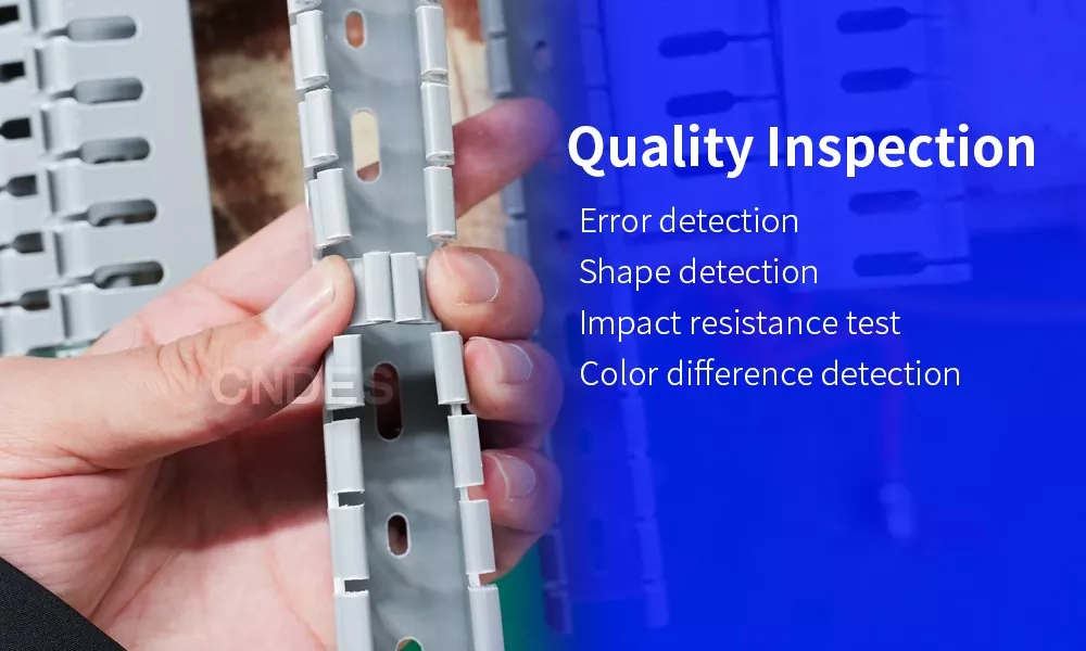 Pemeriksaan kualiti standard tinggi adalah penting untuk menyediakan produk yang baik. Di CNDES, pencarian kualiti kami tidak berkesudahan. Kami tidak berusaha keras untuk menyediakan pelanggan kami produk yang boleh dipercayai. Kami mempunyai empat pemeriksa kualiti yang bekerja mengikut syif untuk menjalankan pemeriksaan dalam talian produk kami. Ini memastikan Salur Kabel Automasi PVC Berslot Ketinggian 80 Ketinggian kami berbentuk segi empat sama, mempunyai permukaan licin, memenuhi piawaian keliatan yang boleh diterima,