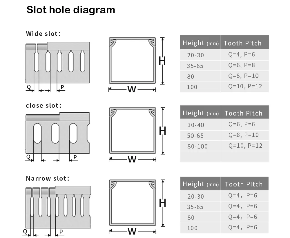 Spesifikasi dulang kabel dinyatakan sebagai tinggi * lebar, dengan unitnya ialah mm. Pertama, tentukan saiz dulang kabel yang diperlukan, seperti tinggi 80mm dan lebar 40mm. Kemudian, pilih lebar lubang alur keluar berdasarkan ketebalan pendawaian, sama ada gigi lebar (8mm) atau gigi halus (4mm). Adalah disyorkan bahawa kabel sebenar menduduki tidak lebih daripada 70% daripada ruang dulang.